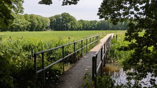Hier is een deel van de beek zonder kronkels. De beek is ongeveer 70 jaar geleden wat rechter gemaakt: gekanaliseerd noem je dat. Daardoor kan het water sneller wegstromen. De beek is de grens tussen Scherpenzeel en Woudenberg. Over de beek sta je in Woudenberg, in de provincie Utrecht. Grappig hè?