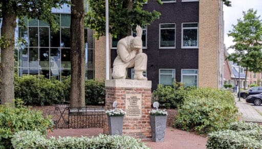 Zie je het beeld met die in elkaar gedoken menselijke figuur? Dit is het verzetsmonument van Scherpenzeel. In de oorlog waren er Scherpenzelers die zich hebben verzet tegen de bezetting van de Duitsers. Op het beeld staan de namen van dorpsgenoten die tijdens de oorlog zijn betrapt en omgekomen, omdat ze hebben meegedaan met het verzet of omdat ze onderduikers in huis hadden. Ze werden neergeschoten of kwamen om in een concentratiekamp in Duitsland. Ieder jaar op 4 mei worden hier de slachtoffers van de 2e wereldoorlog herdacht door de inwoners van Scherpenzeel.